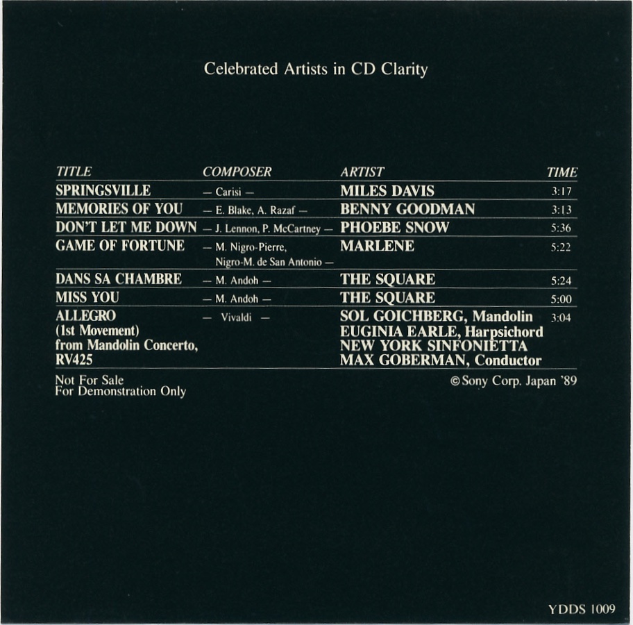 Sony Demonstration Disc · YDDS-1002 · Japan · © 1989 CBS-Sony Group Inc. Sony Demonstration Disc · YDDS-1002 · Japan · © 1989 CBS-Sony Group Inc. Sony Demonstration Disc · YDDS-1002 · Japan · © 1989 CBS-Sony Group Inc. Sony Demonstration Disc · YDDS-1002 · Japan · © 1989 CBS-Sony Group Inc. Sony Demonstration Disc · YDDS-1002 · Japan · © 1989 CBS-Sony Group Inc. Sony Demonstration Disc · YDDS-1002 · Japan · © 1989 CBS-Sony Group Inc. Sony Demonstration Disc · YDDS-1002 · Japan · © 1989 CBS-Sony Group Inc. |