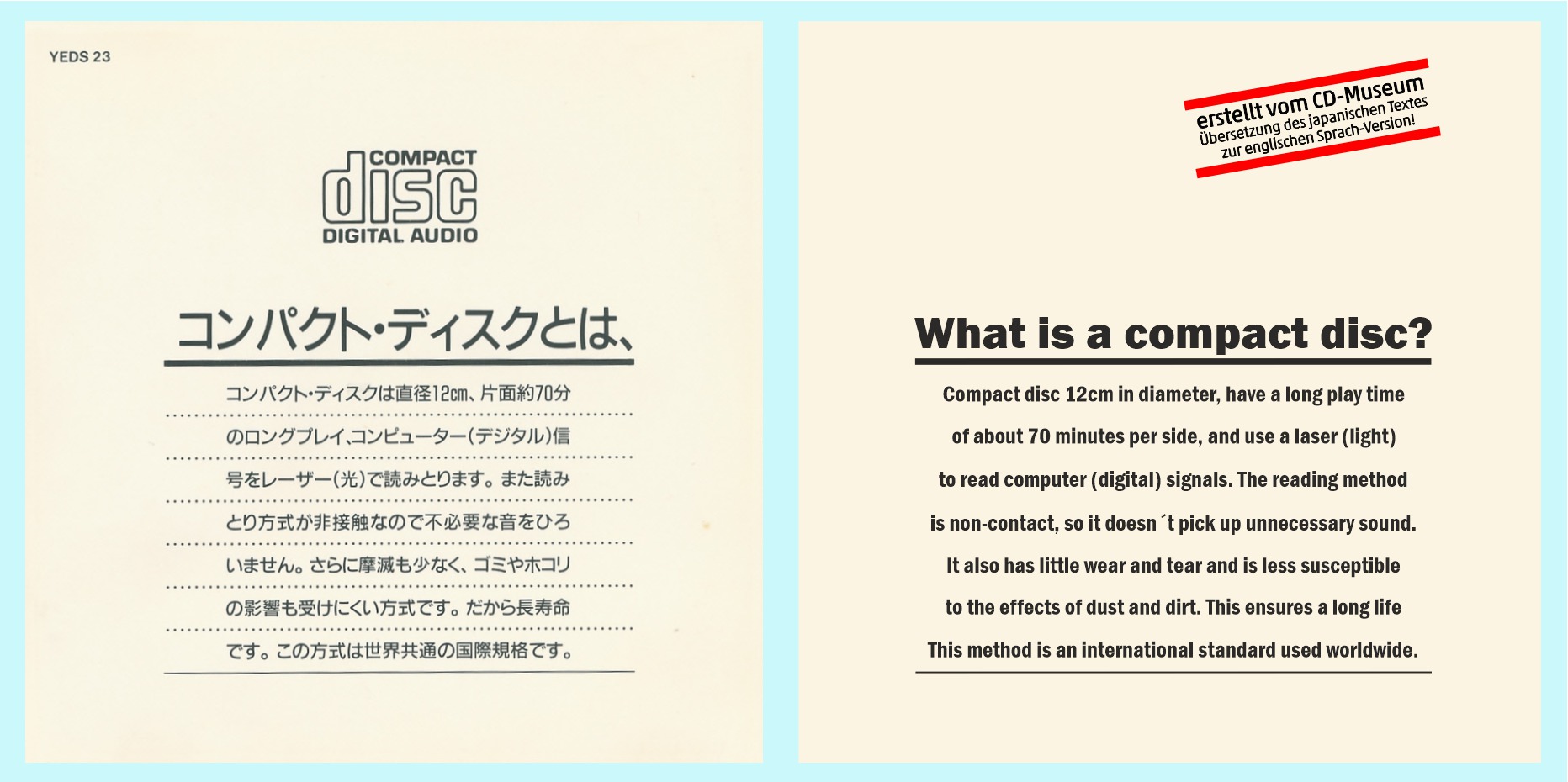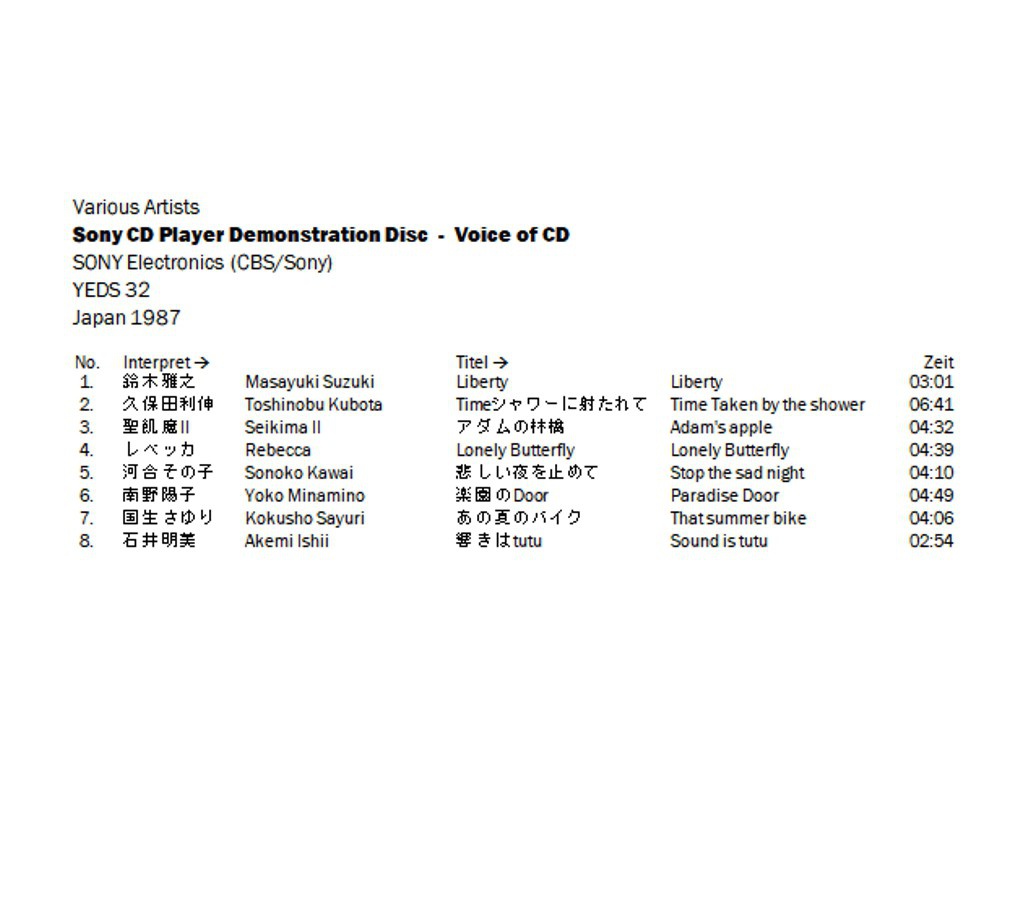 Versuche mit Subcode-Informationen · YEDS-17 · JP · © 1985 Sony Corporation / CBS/Sony Group Inc. Versuche mit Subcode-Informationen · YEDS-17 · JP · © 1985 Sony Corporation / CBS/Sony Group Inc. Versuche mit Subcode-Informationen · YEDS-17 · JP · © 1985 Sony Corporation / CBS/Sony Group Inc. Versuche mit Subcode-Informationen · YEDS-17 · JP · © 1985 Sony Corporation / CBS/Sony Group Inc. |
