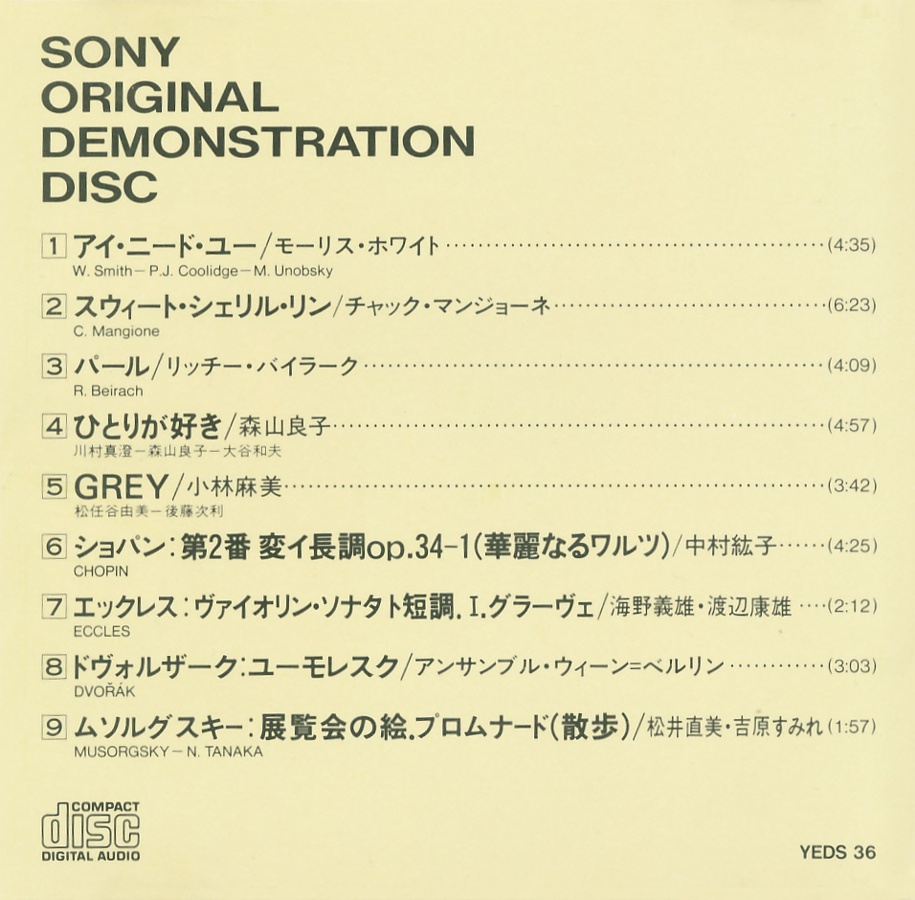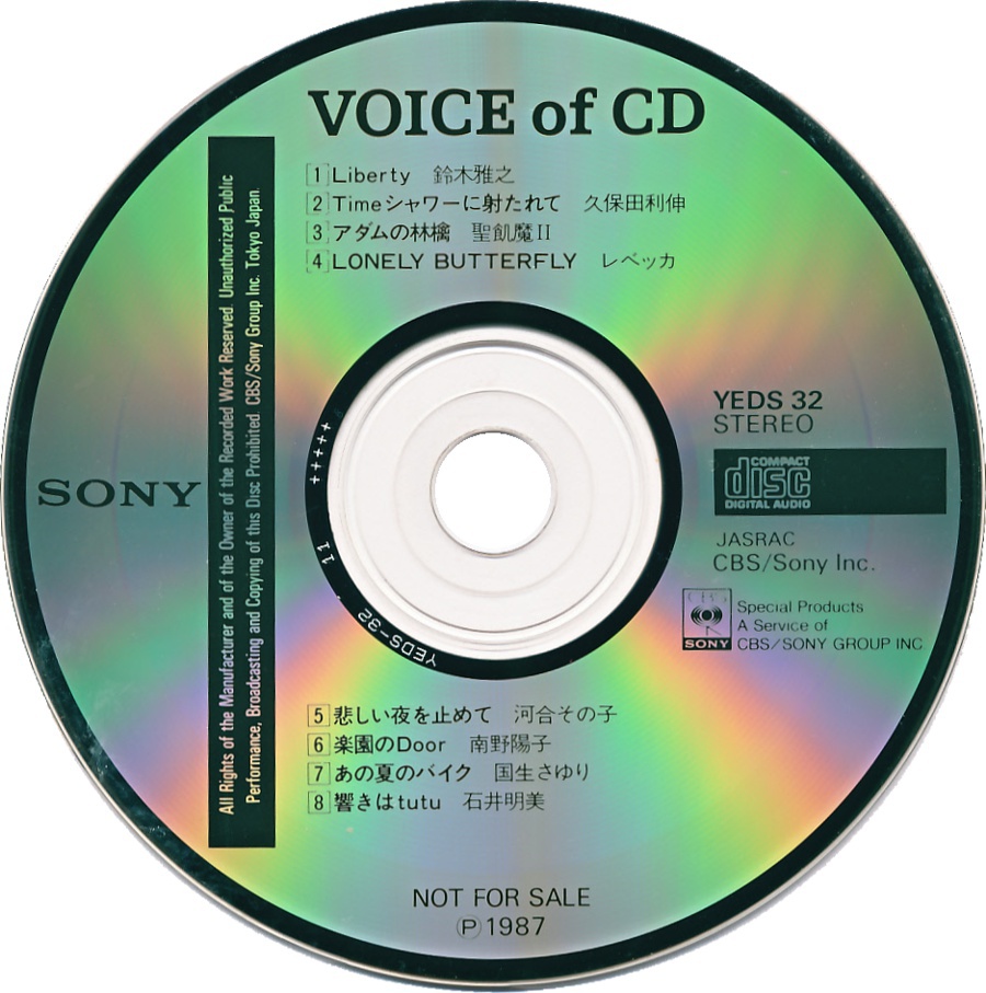 CD Demonstration Disc · YEDS-33 · Japan · © 1987 Sony Corporation / CBS-Sony Group Inc. CD Demonstration Disc · YEDS-33 · Japan · © 1987 Sony Corporation / CBS-Sony Group Inc. CD Demonstration Disc · YEDS-33 · Japan · © 1987 Sony Corporation / CBS-Sony Group Inc. CD Demonstration Disc · YEDS-33 · Japan · © 1987 Sony Corporation / CBS-Sony Group Inc. CD Demonstration Disc · YEDS-33 · Japan · © 1987 Sony Corporation / CBS-Sony Group Inc. CD Demonstration Disc · YEDS-33 · Japan · © 1987 Sony Corporation / CBS-Sony Group Inc. |