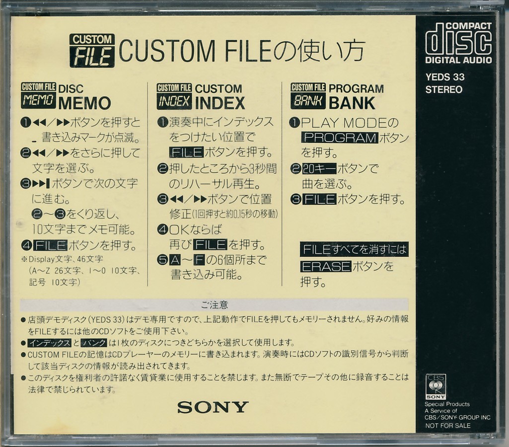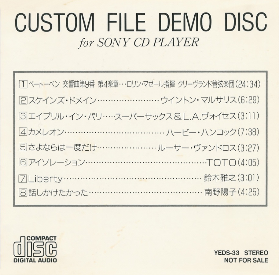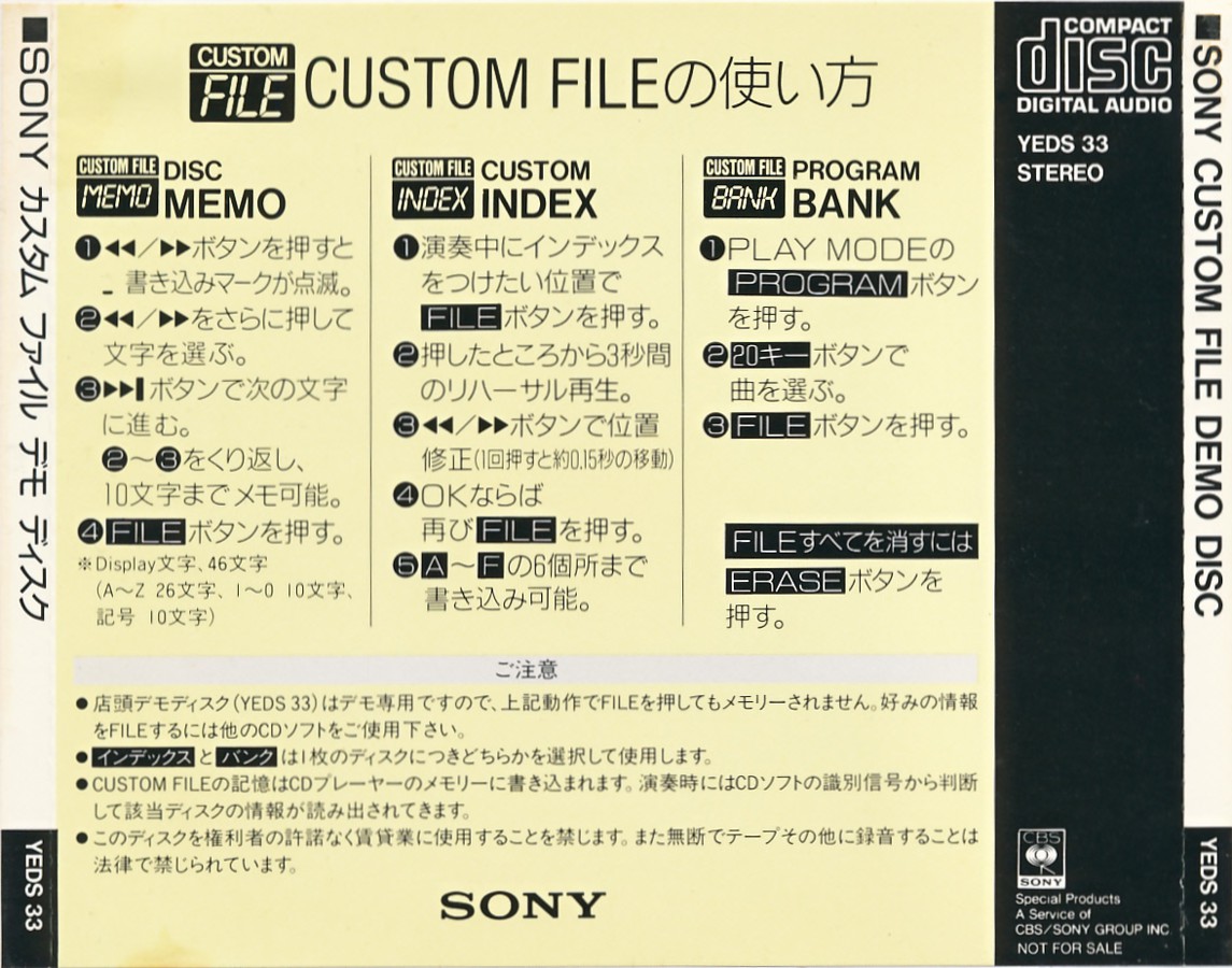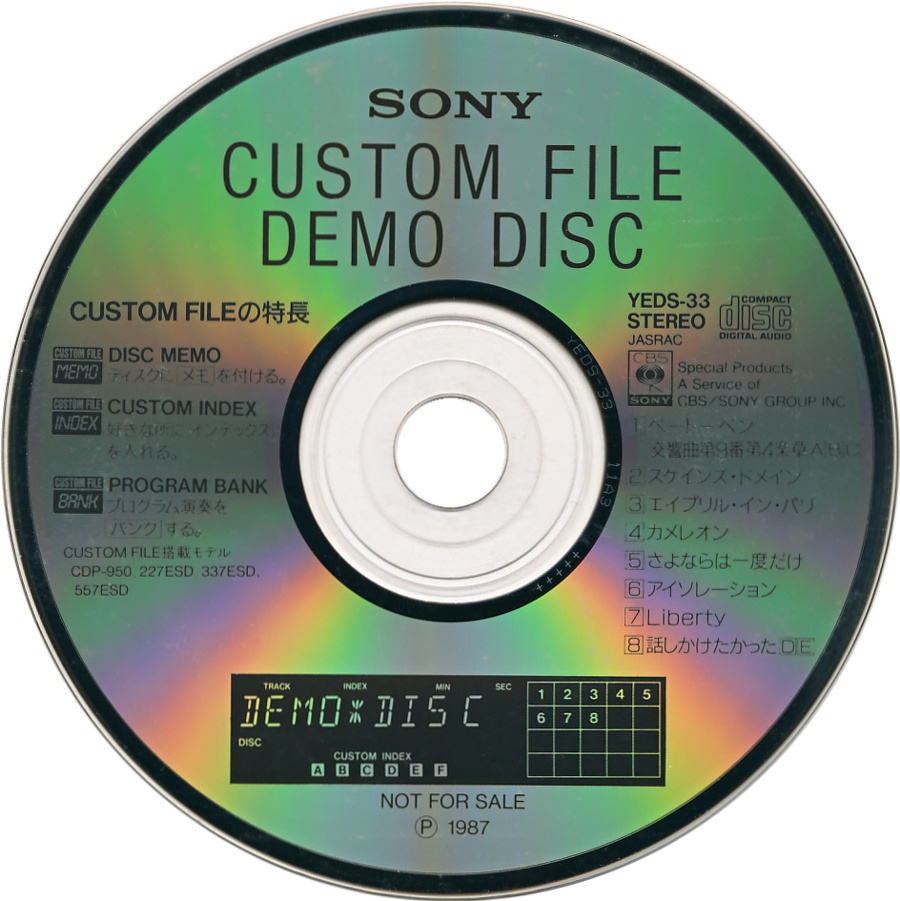 Sony Custom File Demo Disc [YEDS-33 • JP • 1987 • Demo] |